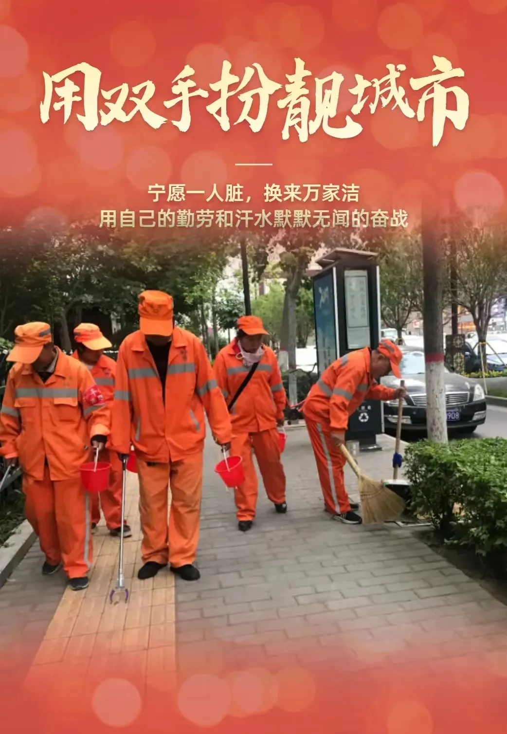 致敬环卫工人,起早贪黑,不怕苦累,用心装扮城市的每一个角落,筑起疫情防控“橙色防线”。