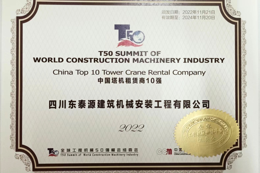 ★这一年,东泰源荣获“2022年中国塔机租赁商10强”奖项,这是一份肯定、殊荣,更是一份责任。